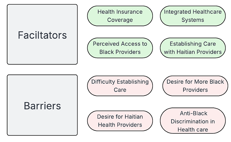 Haitian and Haitian American (hereafter Haitian) communities in the United States (US) face unique challenges when accessing health services. Recent studies focused on exploring the health and healthcare experiences of Haitian immigrants and Haitian Americans in the US, primarily South Florida, New York, and Massachusetts, have reported disparate care for perinatal and reproductive care, cancer screenings and survival, diabetes management, and primary healthcare seeking. Facilitators are broadly defined as having health insurance, social support, and culturally tailored health information. Barriers to healthcare include limited knowledge of the condition, financial constraints, and limited access to necessary tests.